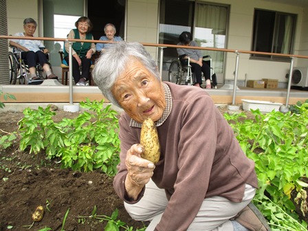 | 従来の小規模多機能型居宅介護の機能に、新たに訪問看護サービスを加えたサービス形態です。訪問看護サービスは医師の指示書のもとにサービスを提供するので、医療との連携が図りやすく、介護、医療、両面から利用者を支えていく事が可能となります。 | 施設で育てたじゃがいもを掘ってくれました♪ たくさん収穫できましたね |